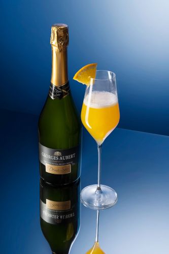 Adicione o suco de laranja à taça. Complete com o espumante demi-sec.